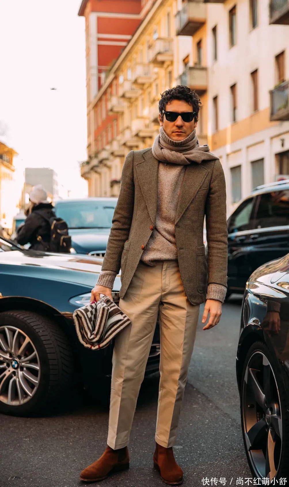 失业商务的技术,不妨聘用修身呢料西装 + 高领毛衣 + 卡其裤 +棕色切尔西靴,既干练又闲雅,提神裤子长度刚好到靴筒,举座线条畅达。