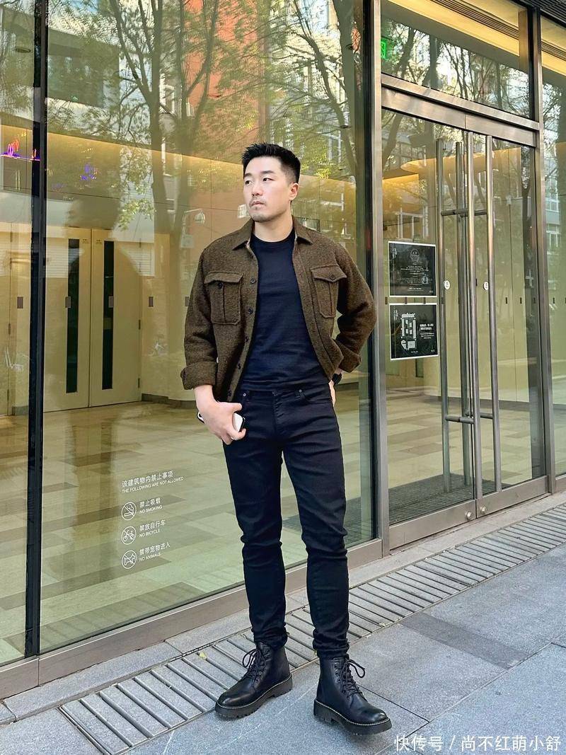 穿玄色马丁靴的技术,上衣可以聘用一件咖色草率玄色的机车夹克 + 节约T恤,下装搭配一条玄色修身,裤脚可以轻细堆积在靴口,营造慵懒的端倪感。