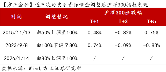 2015年11月:收紧融资保证金比例,由50%上调至100%,沪深3001/3/5个往翌日涨跌幅分散为0.48%/-0.82%/0.75%。